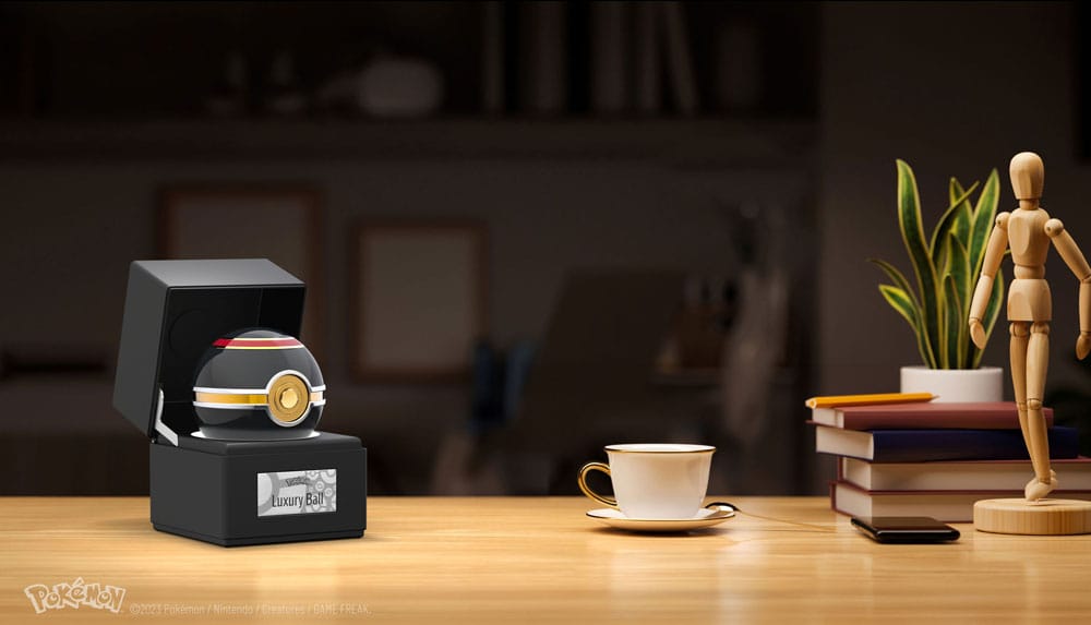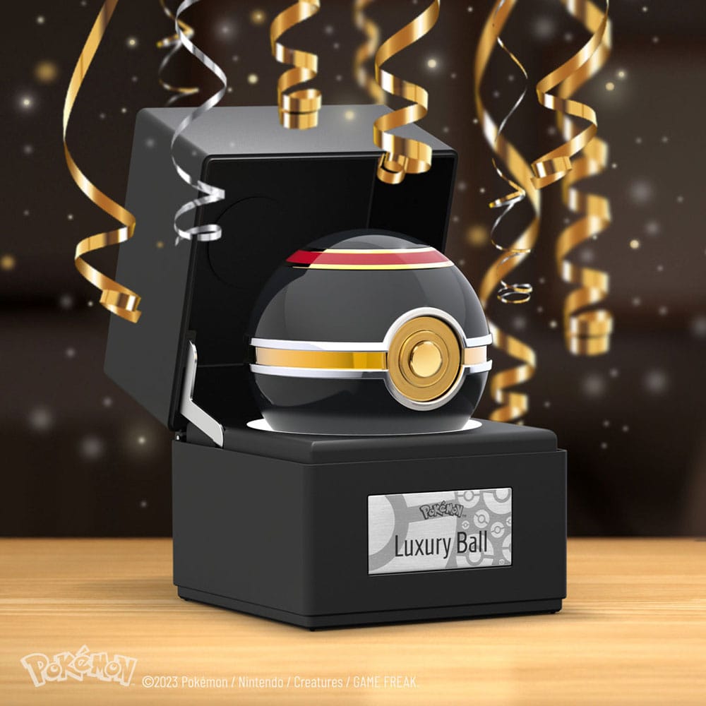 Diese hochwertige, wunderschön akkurate Nachbildung des Luxusballs besteht aus einem Metallgehäuse, hat eine farbenfrohe Oberfläche mit verchromten und vergoldeten Akzenten, ist berührungsempfindlich und verfügt über einen hell beleuchteten Knopf und ein beleuchtetes Präsentationsetui zum Aufklappen. Dieser Luxusball verspricht eine wunderbare Ergänzung für jede Pokémon-Sammlung zu sein!