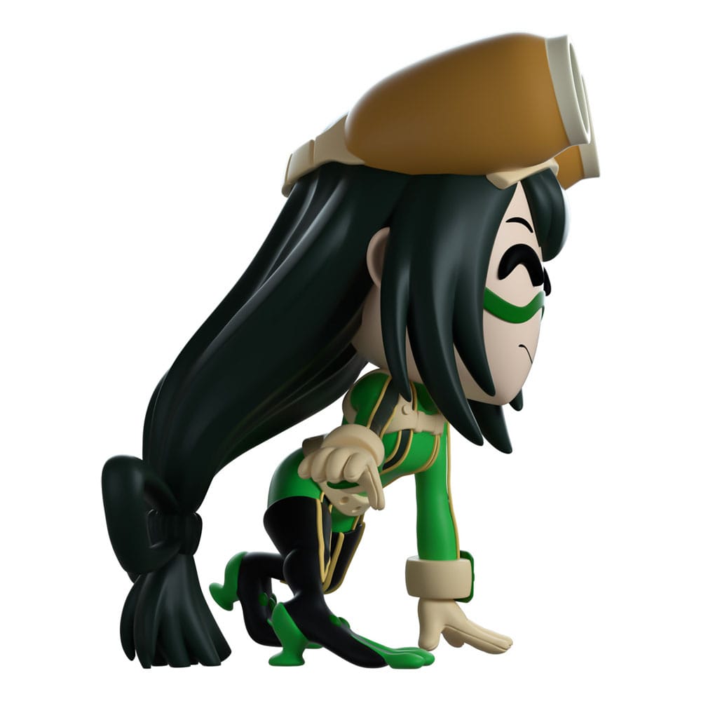 Tsuyu has swum in to not only save the day but also debut her Youtooz figure! Leaning forward at 4 inches tall with her feet and one front hand planted on the floor as she prepares to leap into action, she wears tight one-piece green black and yellow costume with beige gloves and straps. With a green marking running across her face as she sticks a playful tongue out, her long green hair is pulled into a bow to sit behind her and is topped with a pair of large brown goggles. The exterior of her packaging is an illustration of Asui with dual shadows surrounded by slime green impact lines, this palette continues through to its interior to surround them completely as a simple dot pattern fades out from the bottom. The protective sleeve shows a collage of the crew dissected by diagonal lines with the 'My Hero Academia' Logo as his figure can be seen through the large clear window at its front. This collectible ships in a matte, embossed, protective outer sleeve and a custom sized plastic protector for maximum protection during shipping.