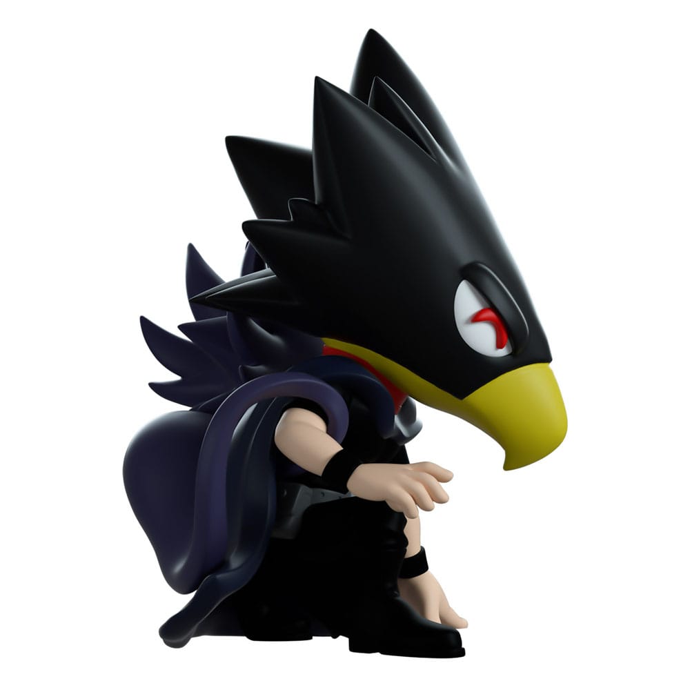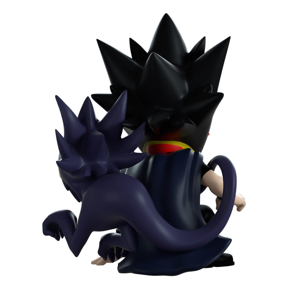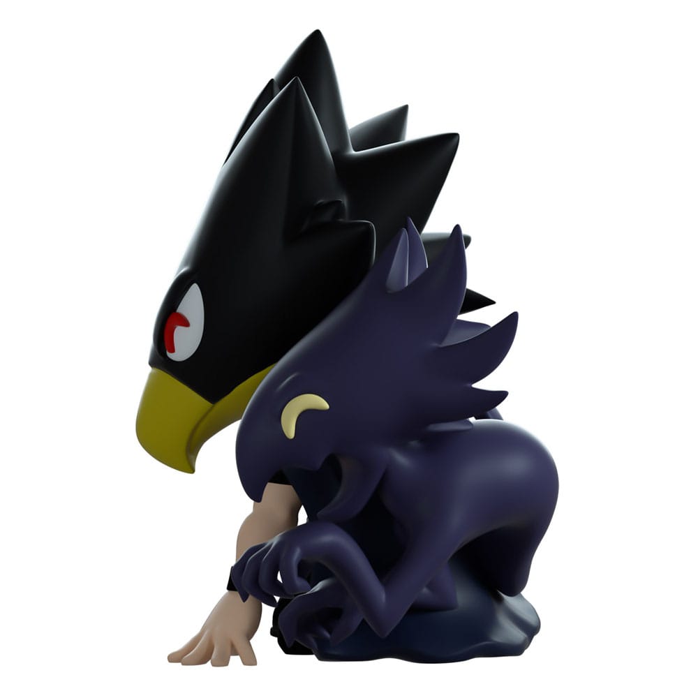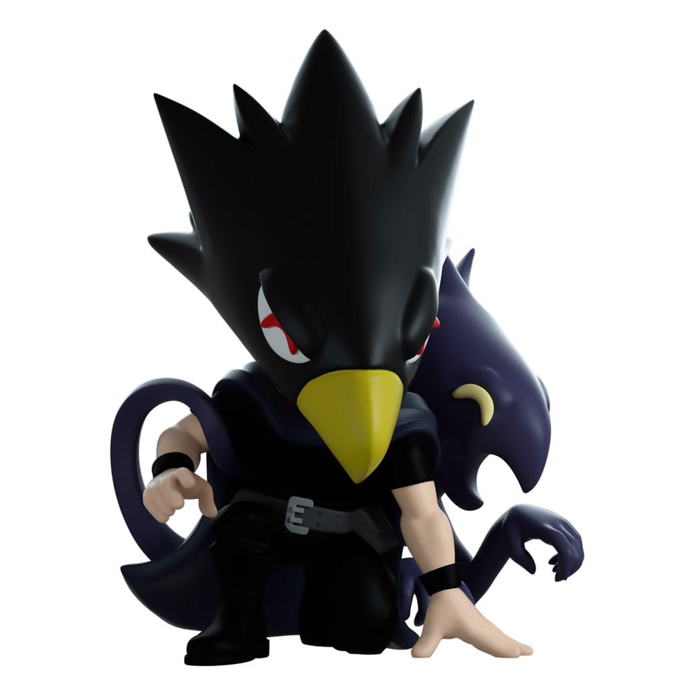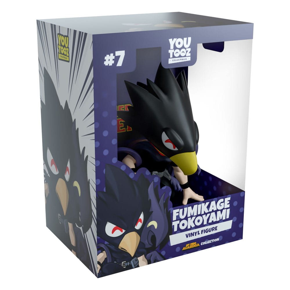 Tokoyami heard the call and swung into Youtooz for backup! Crouched on one knee at 4.1 inches tall with his fingertips pressed to the ground, his long avian head stretches down to a point with a brown beak and bright red eyes as thick feathers fan out from the back. Dressed all in black so he can make his way through the night and wearing a grey utility belt, his Dark Shadow curls its way around his body to raise their hand eerily with a gaping open smile. The exterior of his packaging is an illustration of Tokoyami with dual shadows surrounded by midnight blue impact lines, this palette continues through to its interior to surround them completely as a simple dot pattern fades out from the bottom. The protective sleeve shows a collage of the crew dissected by diagonal lines with the 'My Hero Academia' Logo as his figure can be seen through the large clear window at its front. This collectible ships in a matte, embossed, protective outer sleeve and a custom sized plastic protector for maximum protection during shipping.