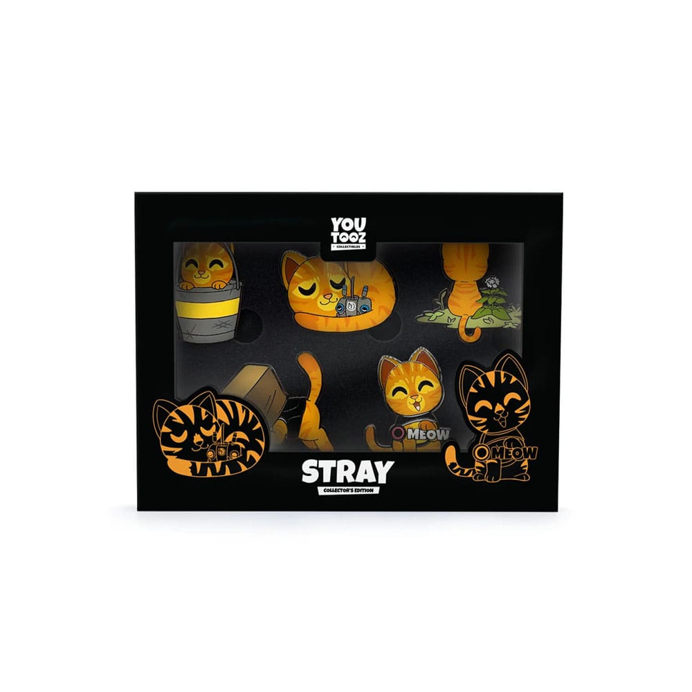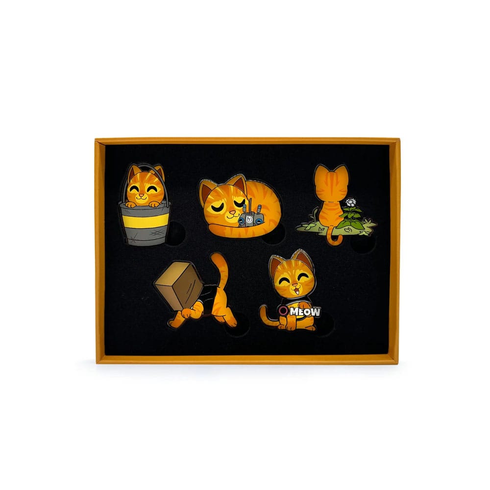 Présentoir de 5 badges en métal émaillé taille env. 9 cm, en emballages boîte-mystère.